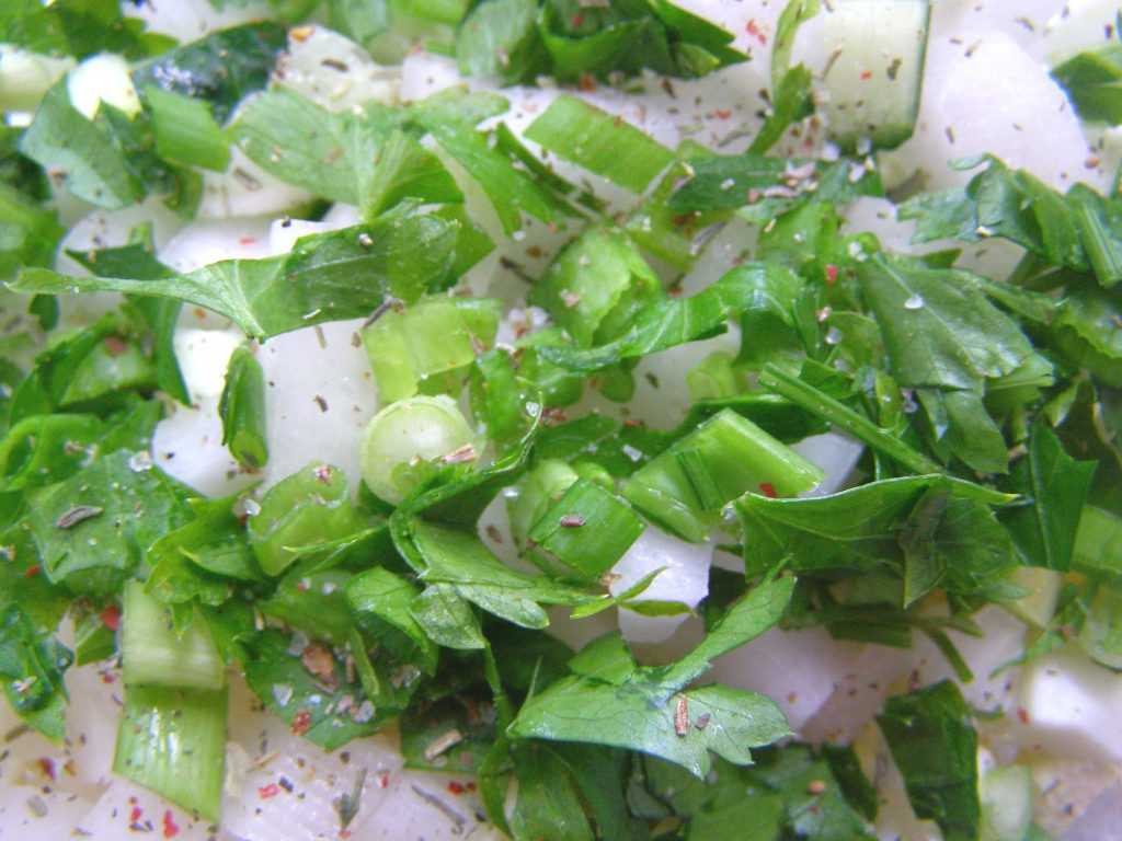 И редька, и огурец – это ингредиенты, которые надо нарезать в последнюю очередь. Поэтому давайте настрогаем зелени. Понятно, что ее может быть больше!