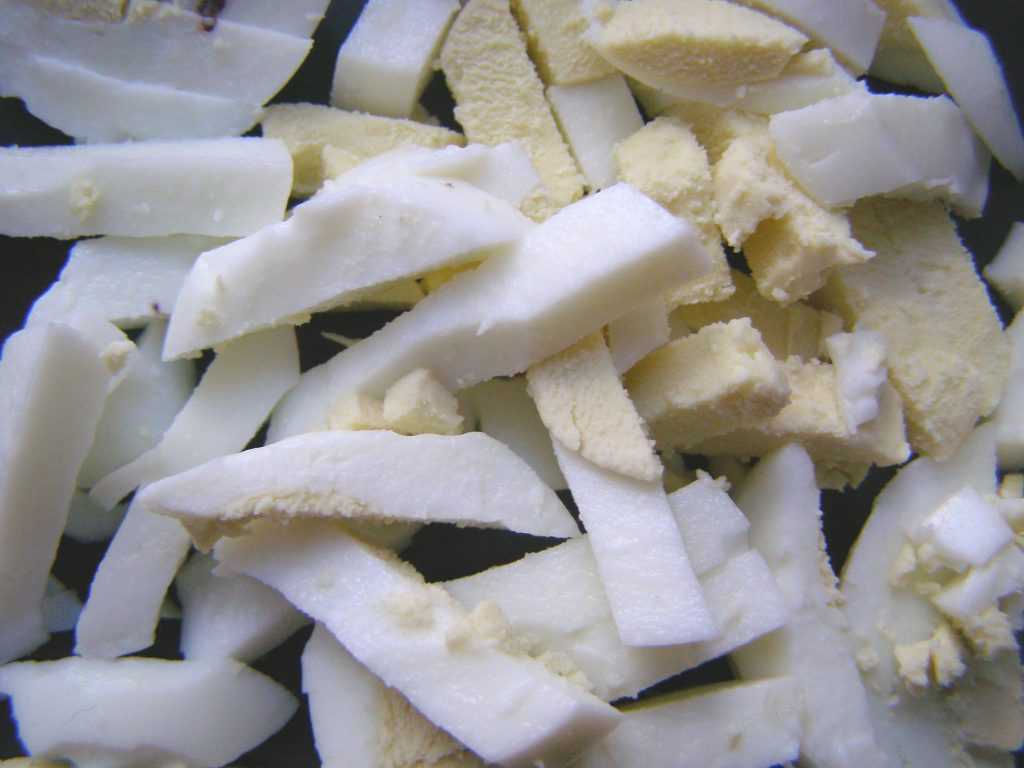 Для салатов я всегда делаю разные заготовки. И яйца в этом перечне занимают первую строчку. Несколько штук отварных яиц у меня всегда найдется в холодильничке. У вас нет? Отварите, это же несколько минут. Охладите, очистите и нарежьте примерно так.