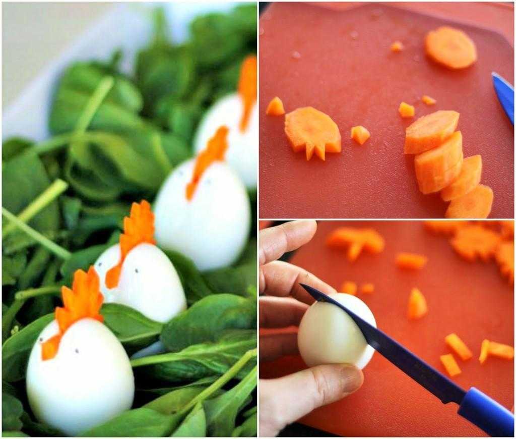 Ну, разве не милашки! Отвариваем яйца, аккуратно срезаем острый конец яйца, до желтка. Желток нужно вынуть, размять вилкой и смешать, к примеру, с плавленым сыром. Начинкой вновь наполнить яйцо, накрыть “шляпкой из белка”. Глазки цыплятам делаем из черного перца, клюв и лапки из вареной моркови.