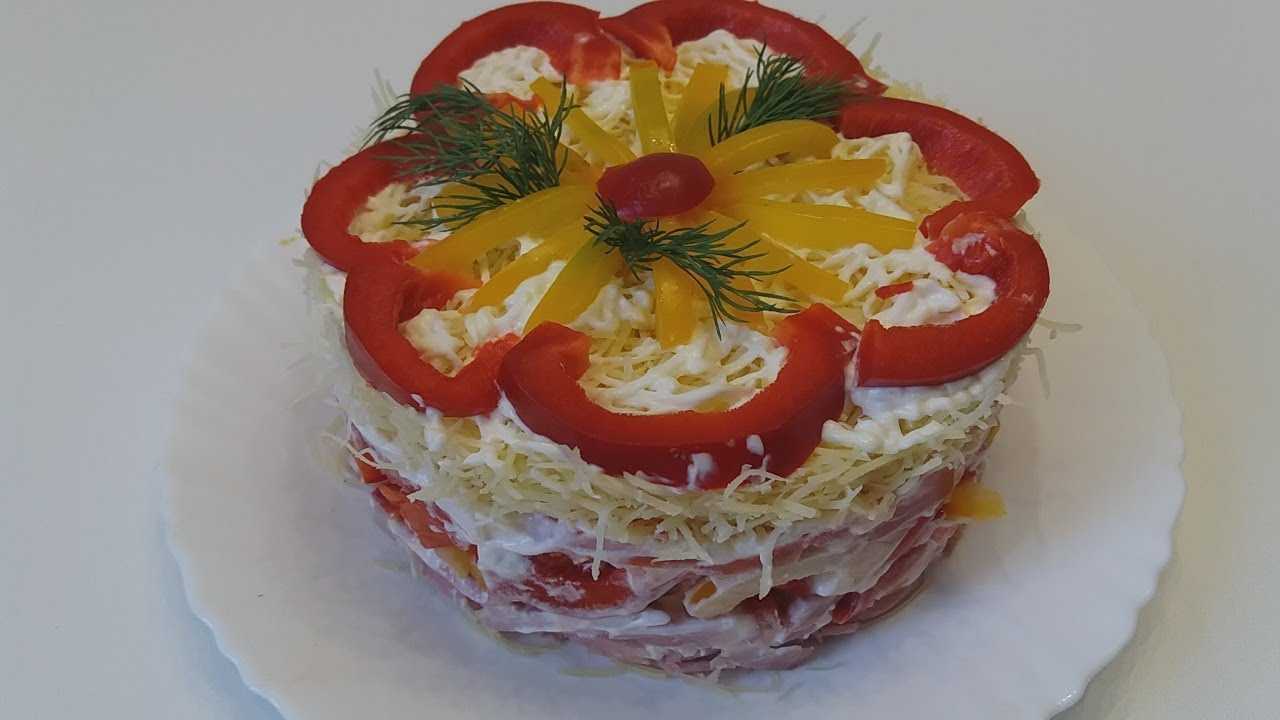 6. Финишным слоем укладываем соломку из ветчины. Она достаточно гибкая, можно свернуть в виде розочки, спиральки или просто красиво расположить.