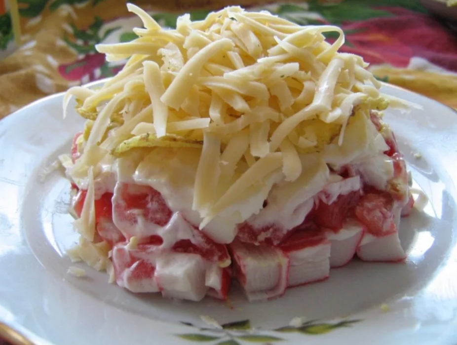 Рецепт слоеного салата с крабовыми палочками, помидорами и сыром