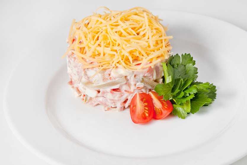 Многие рекомендуют измельчать ингредиенты для одного салата одинаково, но такую точку зрения мы не разделяем, потому что картофель или сыр, нарезанные кубиками в данном салате будут весьма неуместны.