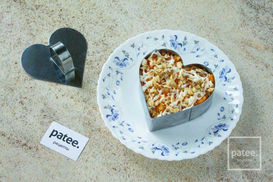 Морковь по-корейски. После майонезной сеточки грецкие измельченные орехи и снова майонезная сеточка. Грецкие орехи перед этим прокаливаем на сухой сковороде 3-4 минуты.