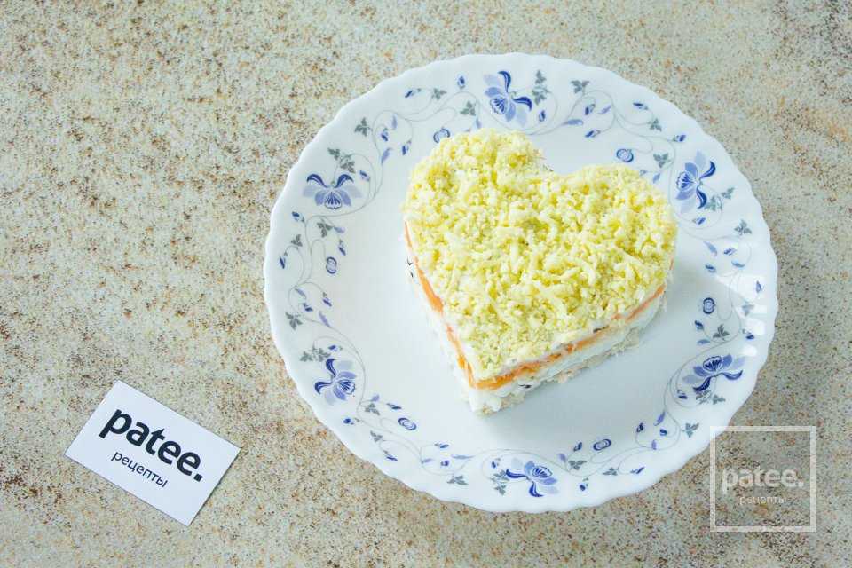 √ И завершающий слой седьмой – шапка из сыра, пропущенного через тёрку. Сырную шапку также пропитываем майонезом.