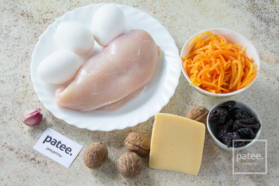 Для приготовления салата нам понадобятся филе куриное, морковь (по-корейски), сыр твёрдый, чернослив, яйца куриные, орехи грецкие, чеснок и майонез.