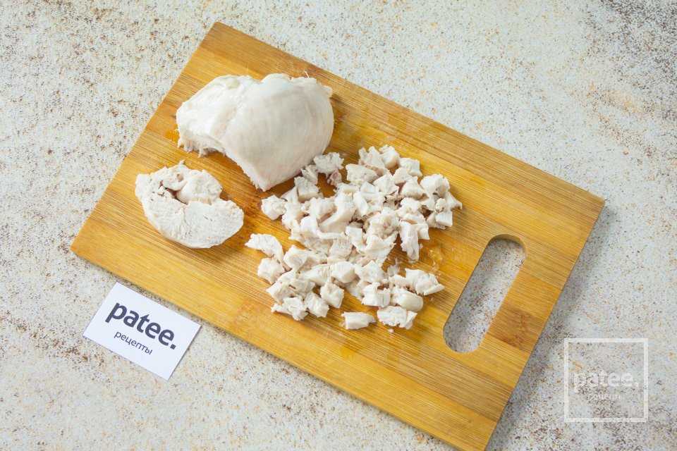 Куриное филе промойте, залейте водой. Отварите в подсоленной воде на медленном огне в течении 25 минут. Воду слейте, филе остудите. Нарежьте его затем мелкими кубиками.
