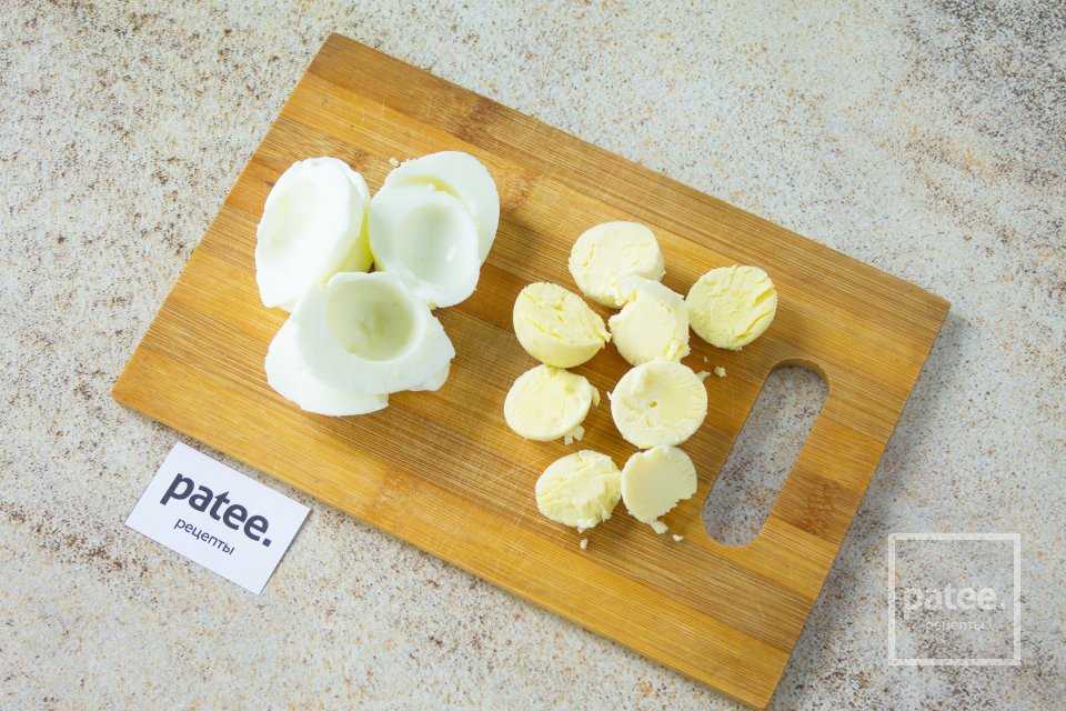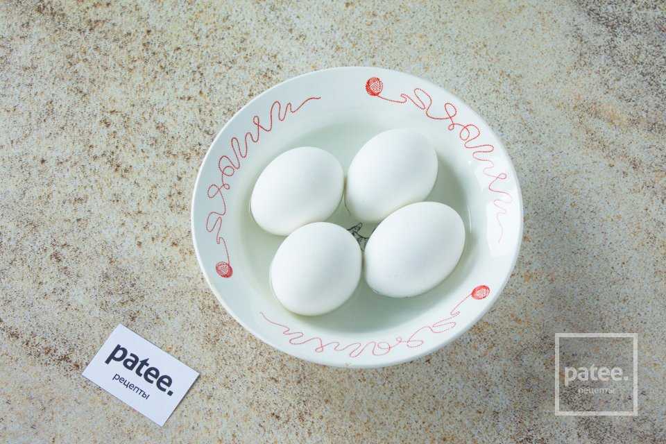 Отварите яйца вкрутую. Перед отвариванием яиц, воду, в которой вы будете это делать, нужно хорошенько посолить — 3 ч. л. на литр воды. Помутневшая жидкость будет говорить о том, что соли вы положили достаточно для того, чтобы яйца не потрескались. Сваренные яйца погрузите под проточную воду комнатной температуры, постепенно понижая градус. Это поспособствует хорошей очистке яиц от скорлупы.