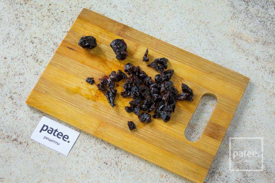 Чернослив тщательно промойте, обсушите и нарежьте небольшим кубиком. Если чернослив сухой, его нужно замочить в кипятке на 10 -20 минут, а уже после этого резать его на кусочки.