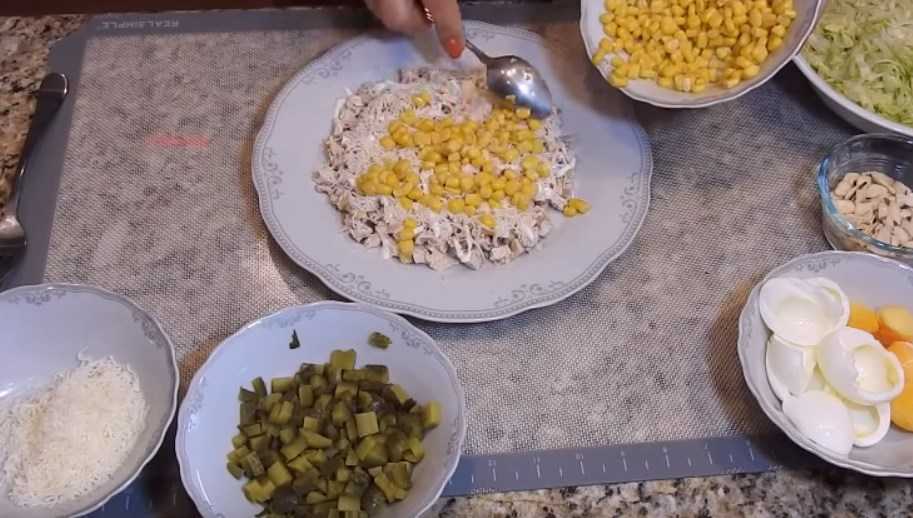 Кроме перечисленных продуктов, понадобится майонез (триста грамм), зеленый горошек, а также зелень, зерна граната и маслины, которые будут использованы для украшения блюда.