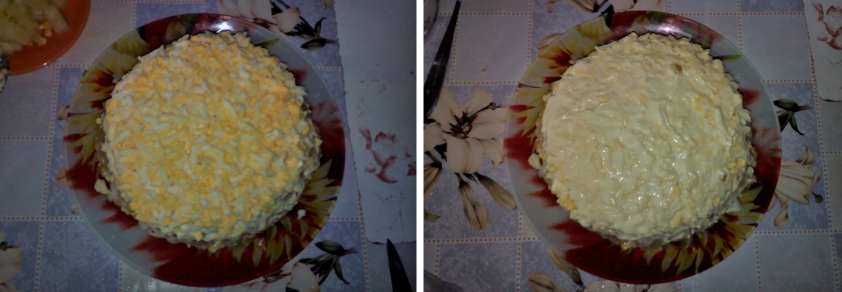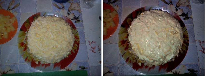 Половиной крупно тертого сыра (то есть 100 грамм) посыпаем ананасы и снова добавляем майонез.