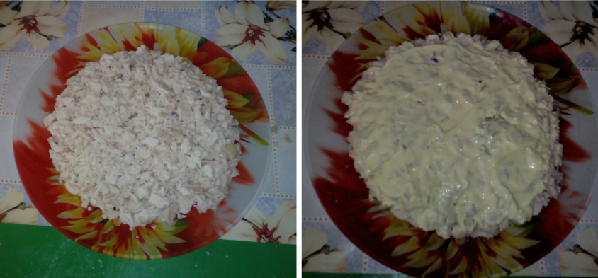 Нарезаем курицу небольшими кусками и делим ее на 2 равные части. Выкладываем первую часть в один слой на сервировочной тарелке и делаем на ней тонкую майонезную сеточку.