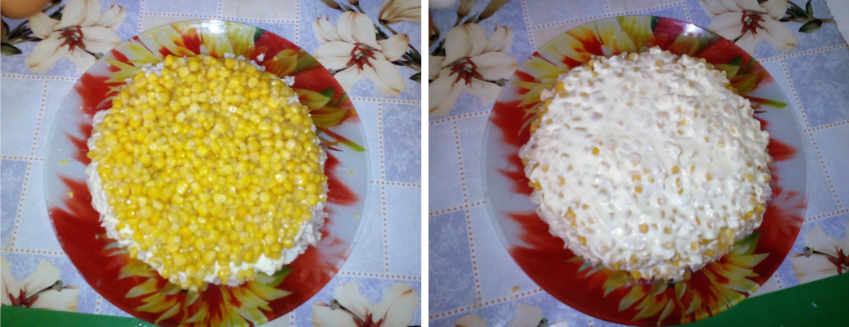6. Сверху курицы выложите кукурузу, предварительно слив с нее всю жидкость. Кукурузу тоже смазываем немного майонезом.