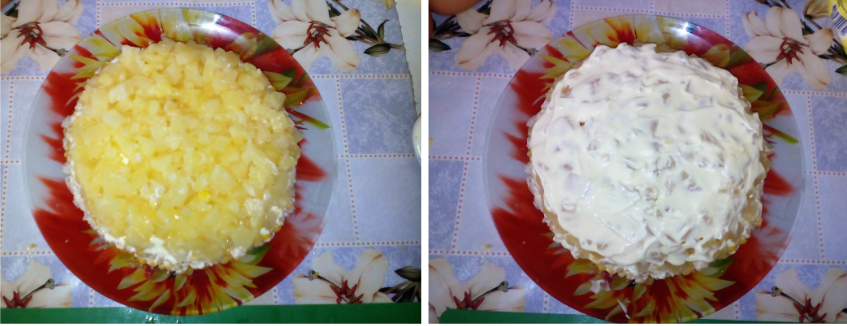 8. Выложите ананасы на кукурузу и так же смажьте майонезом.