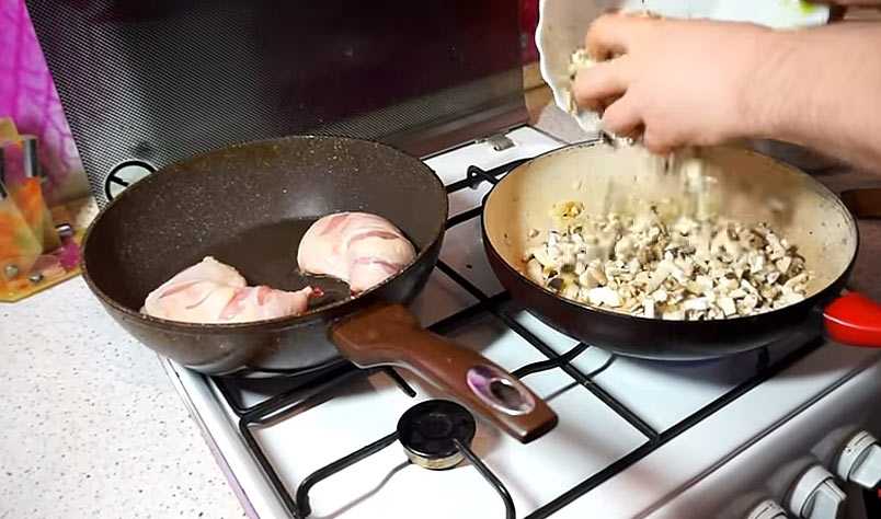 Натираем филе солью и другими приправами по вкусу. Ставим на огонь сковороду, наливаем туда небольшое количество растительного масла и жарим мясо до готовности. Готовое мясо нарезаем кубиками. Теперь, очередь за грибочками. Их нарезаем мелкими ломтиками, аналогично нарезаем лук. Сковорода смазывается подсолнечным маслом, и в нее сыплется лук. Как только лук приобрел прозрачность, добавляем к нему грибы и жарим, пока не выйдет из шампиньонов вода.