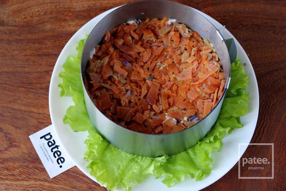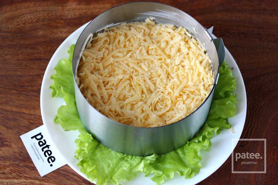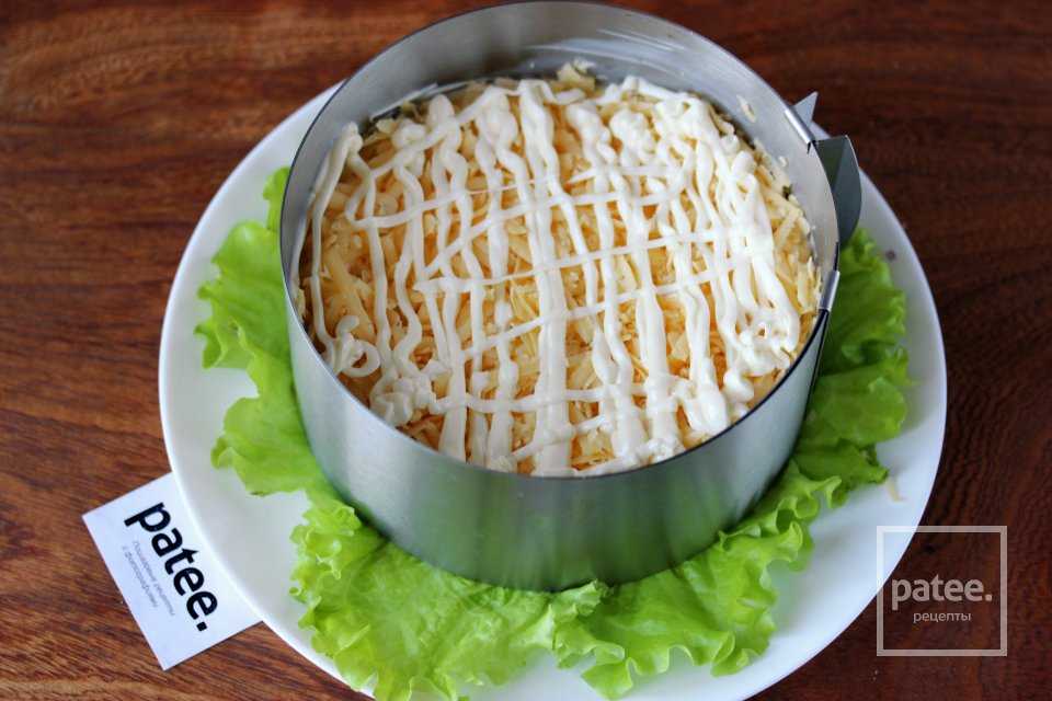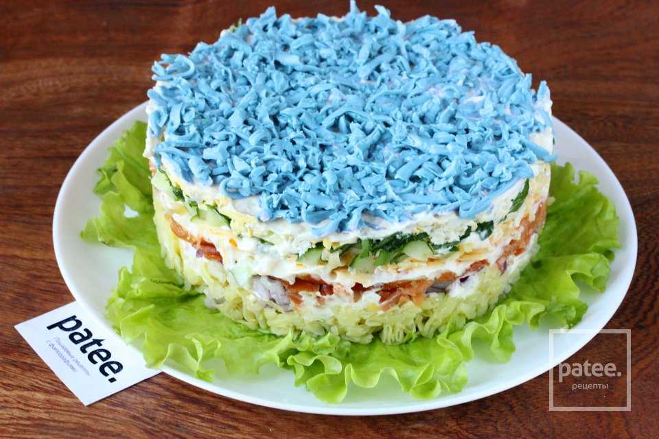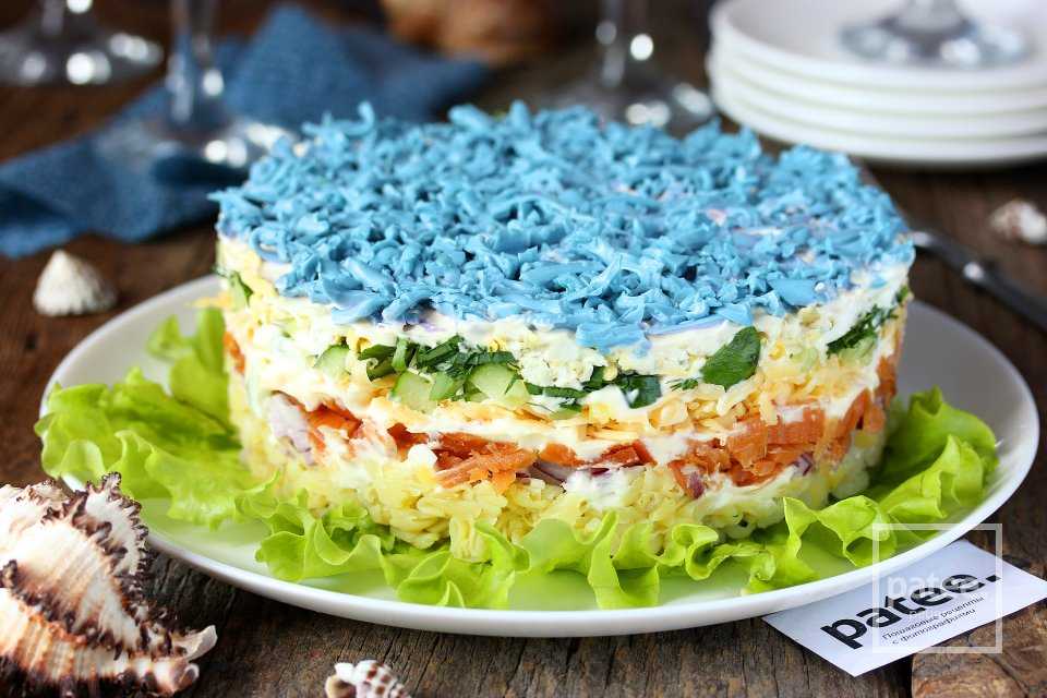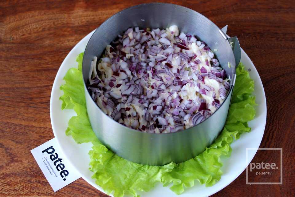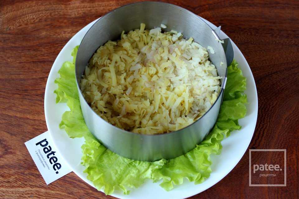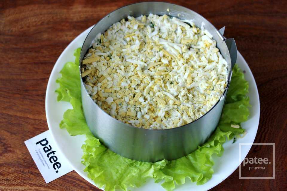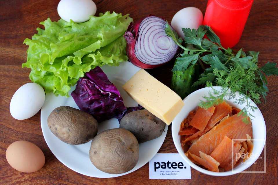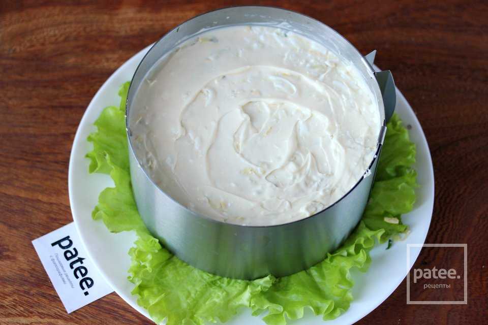 Блюдо может заменить традиционный оливье. Готовится быстро, получается сытно и питательно. Заранее отваривают яйца и картофель.
