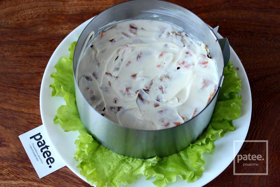 1-й слой: крабовые палочки , нарезанные мелким кубиком.