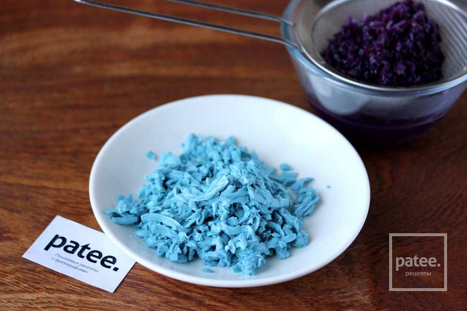 Для приготовления салат вам потребуется: 400гр крабовых палочек, 400гр в/м мидий, яйцо 6 шт, майонез, лист салата, сок краснокочанной капусты.