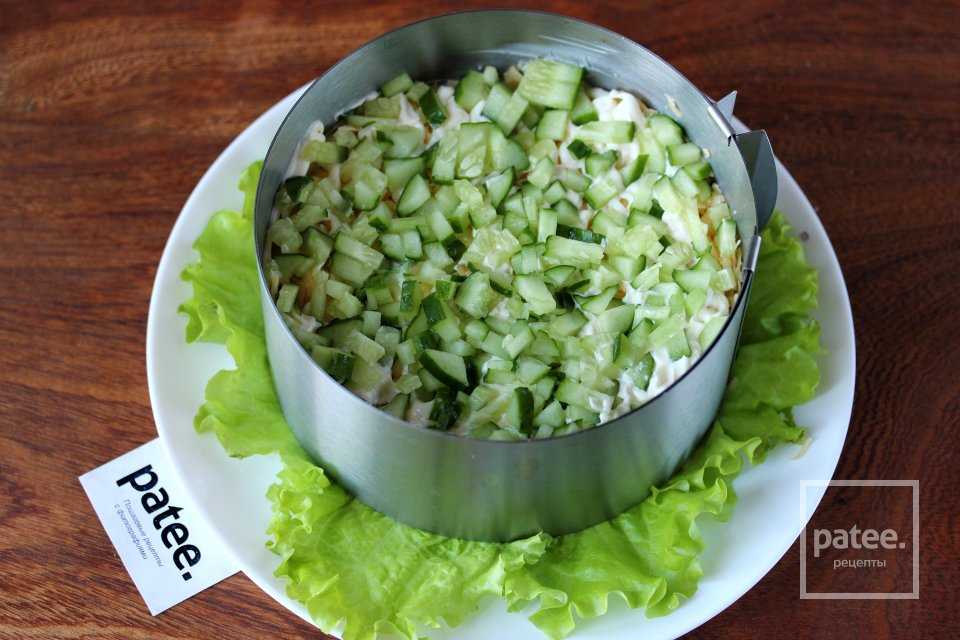Свежий огурец сполоснуть и просушить, нарезать полосками или брусочками. Добавить в салат.