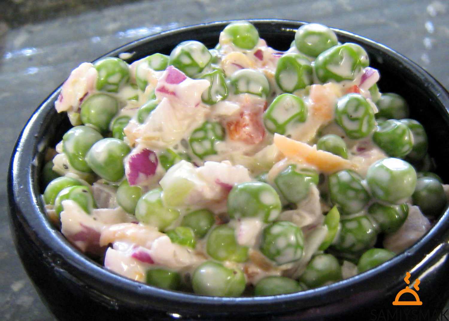 - Редис с луком соедините в чашке. Заправьте сметаной, солью, перцем.
