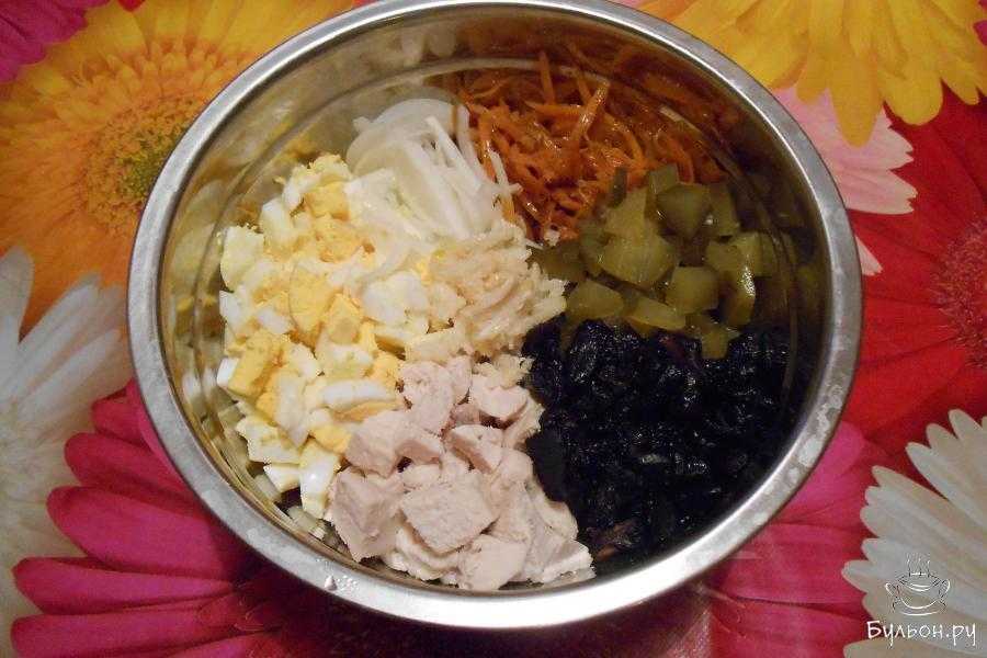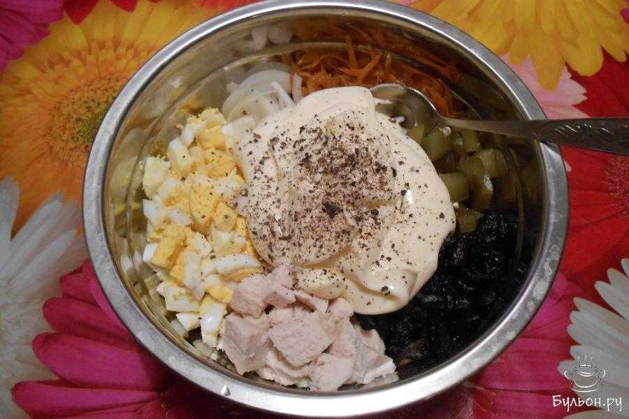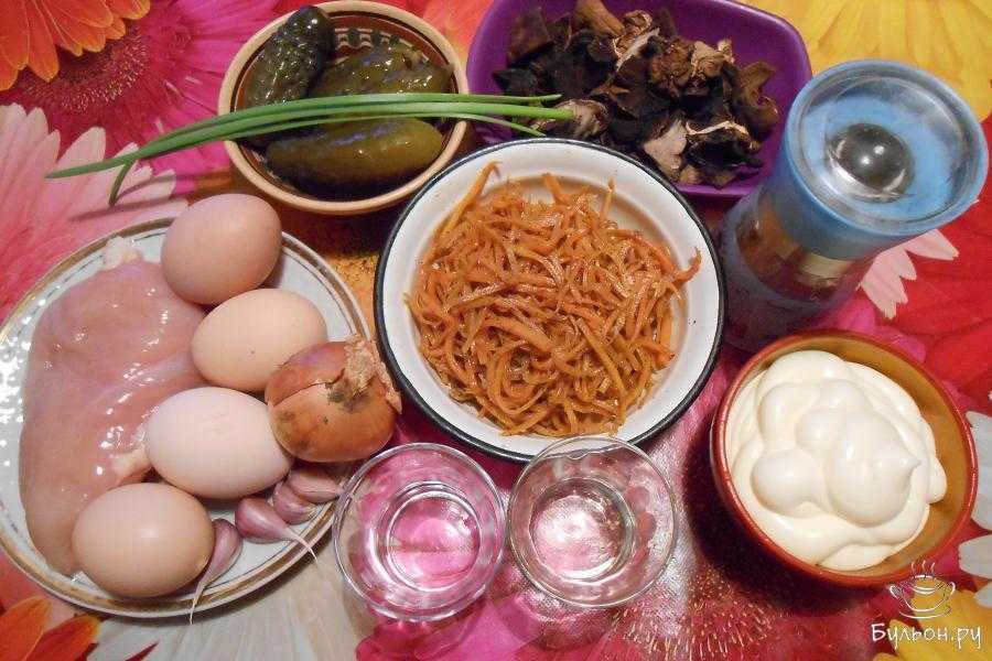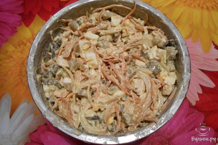 Соединить в глубокой миске морковь по-корейски, маринованный лук, яйца, огурцы, отварные грибы и куриное филе и чеснок, выдавленный через пресс.