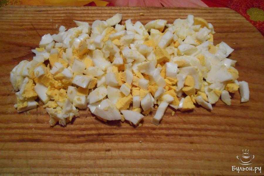 - Овощи и яйца отварите, мелко порежьте или измельчите с помощью терки.