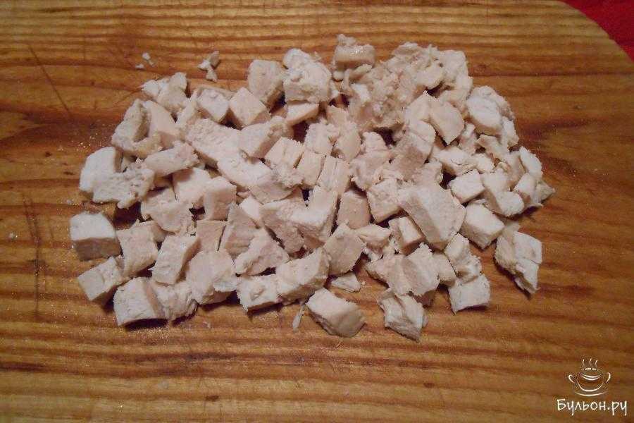 Начинается сборка салата. Остывшую курицу порезать на кусочки.