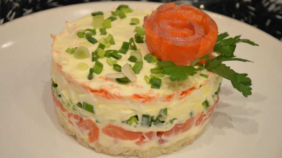 Пекинскую капусту нашинковать, посолить и помять руками. Выкладываем в салатницу следующим слоем и обмазываем майонезом.