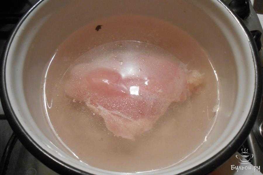 Предварительно требуется несложная подготовка продуктов. Куриное мясо вымыть, положить в кастрюлю с холодной водой, добавить соль и специи, отварить.