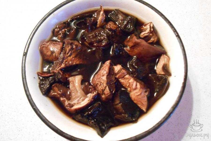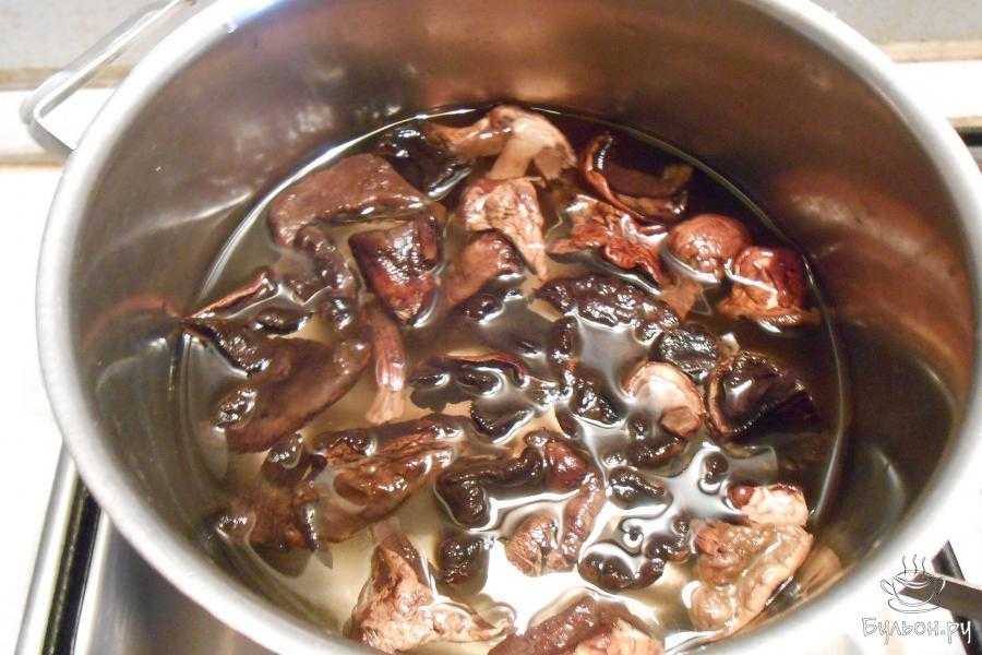 Сушеные грибы залить100 мл воды и оставить на 30 минут. Слить воду и промыть.