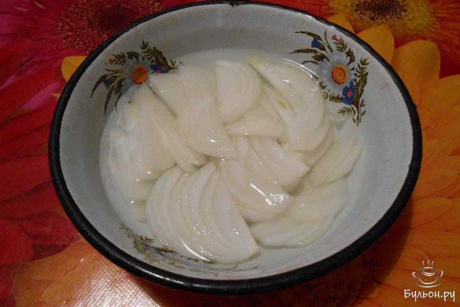 Лук почистить и нарезать полукольцами. Залить минеральной водой и уксусом 1:1. Оставить на 15 минут. Откинуть на дуршлаг и дать стечь маринаду.