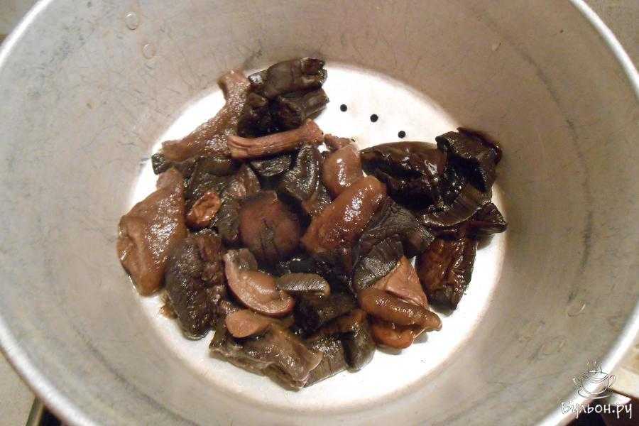 Положить грибы в кастрюлю, налить 500 мл воды, довести до кипения и снять пенку. Варить 30 минут. Слить воду, промыть грибы.