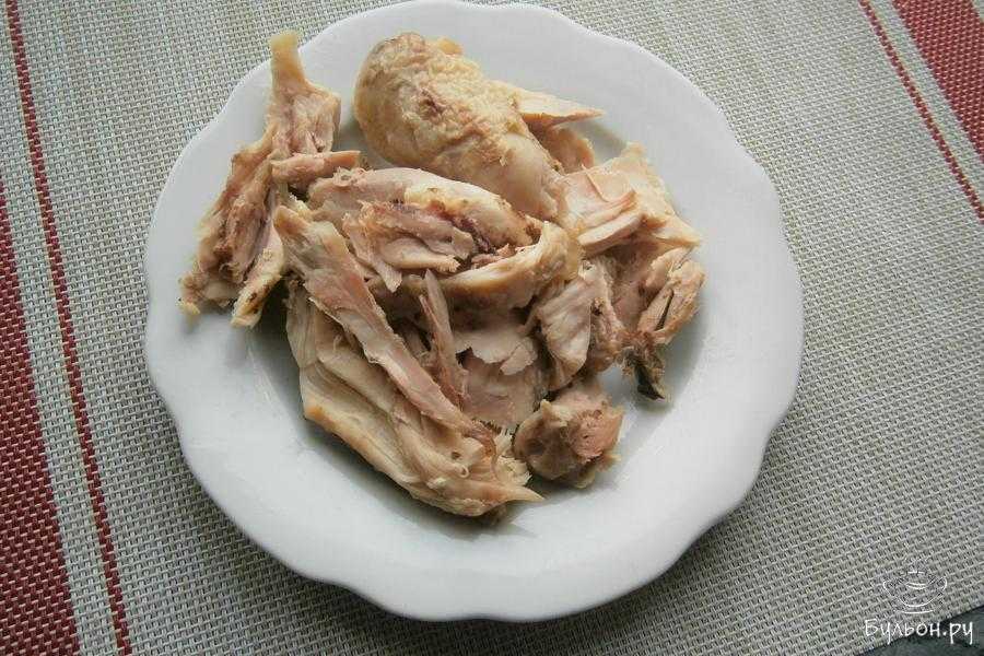 Курицу – куриную грудку или ножку, после остывания нарежьте небольшими кусочками.