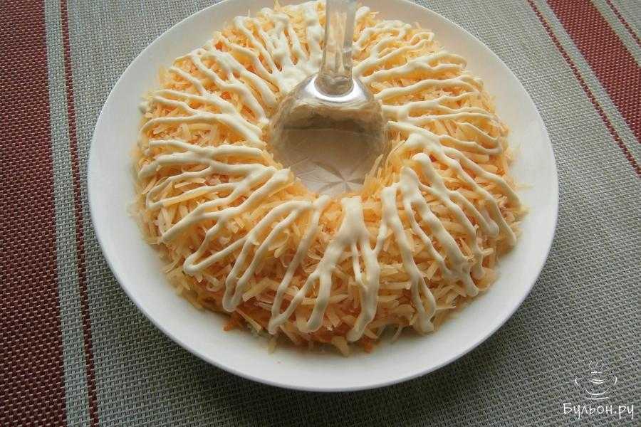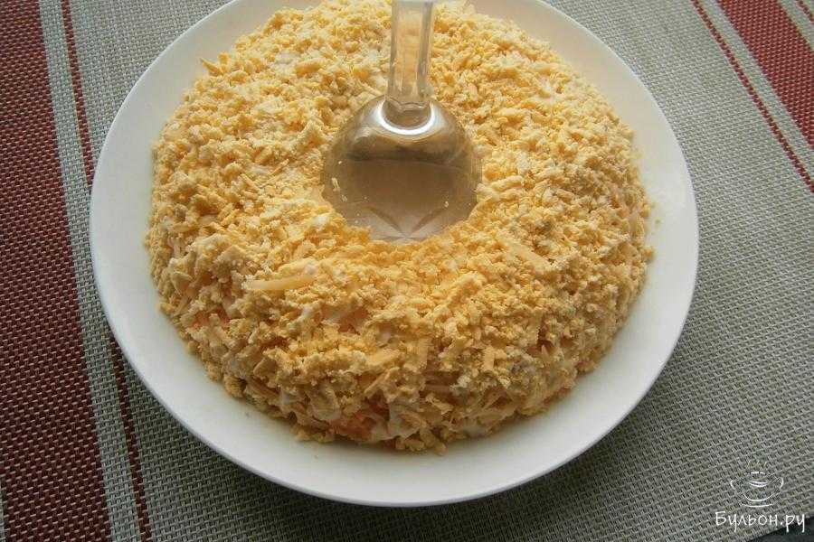 - Последний слой — тертые яйца. На них можно нанести майонезную сеточку, а можно оставить так как есть.