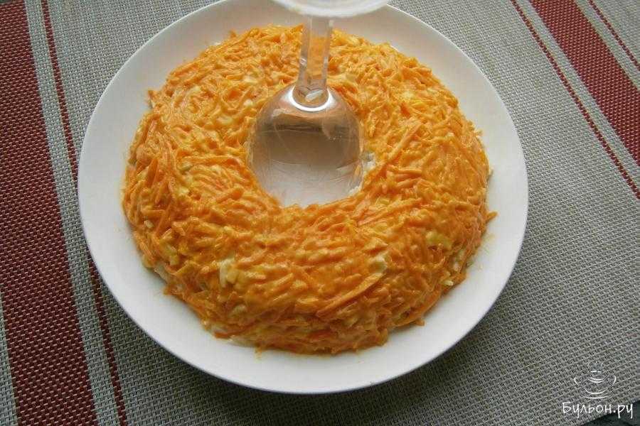- Следующим слоем идет тертая отварная морковь + майонез.
