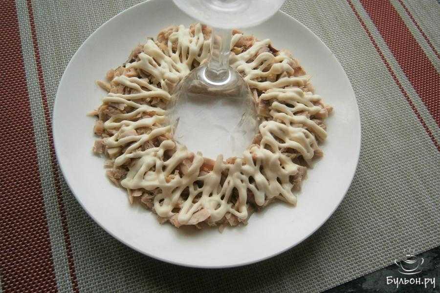 - На плоское блюдо поставить в центр стакан и выложить вокруг него отварное куриное мясо, которое надо нарезать кубиками небольшого размера. Нанести сверху майонез. Удобно наносить из кондитерского мешка или из мягкой упаковки майонеза, отрезав кончик у упаковки.
