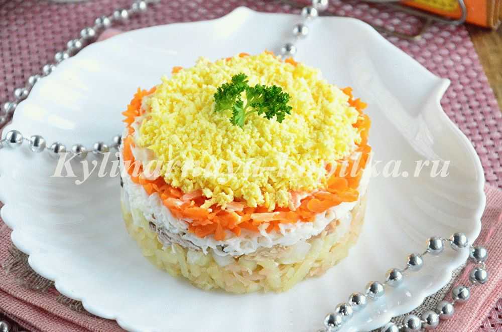 - Сверху картофеля выкладываются крабовые палочки. А далее – сыр – размятая вилкой рыба без масла — белки – желтки. Не стоит забывать солить слои и мазать их майонезом.