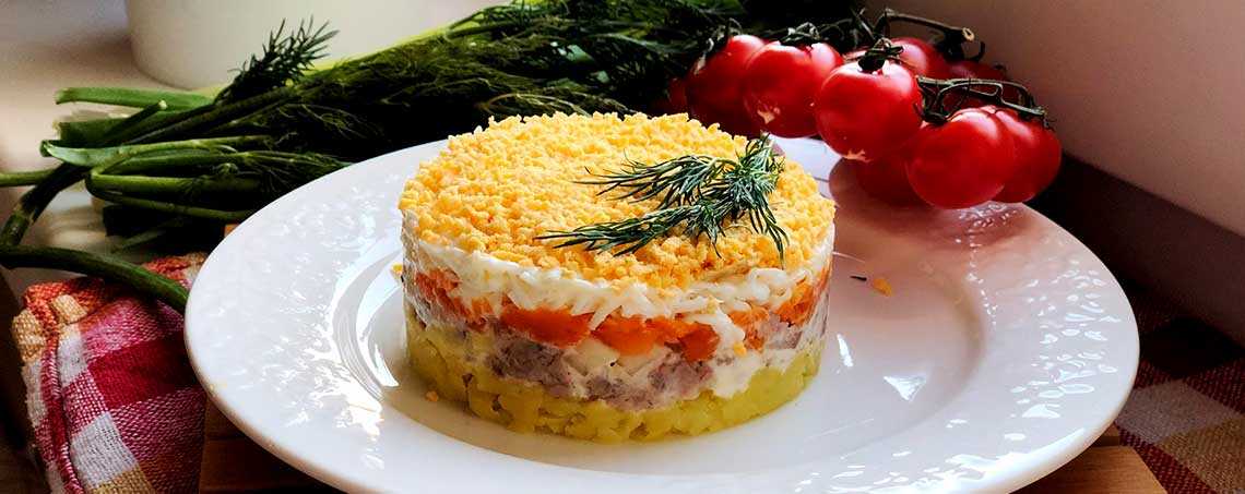 Это тот самый рецепт из далекого детства. На сегодняшний день самый популярный и традиционный. За несколько десятилетий его изменяли, дополняли новыми или, наоборот, убирали ингредиенты, в другой очередности выстраивали слои. Но этот, классический, многими так и остался любим. И в таком варианте присутствует на многих столах во время торжеств и праздничных событий.