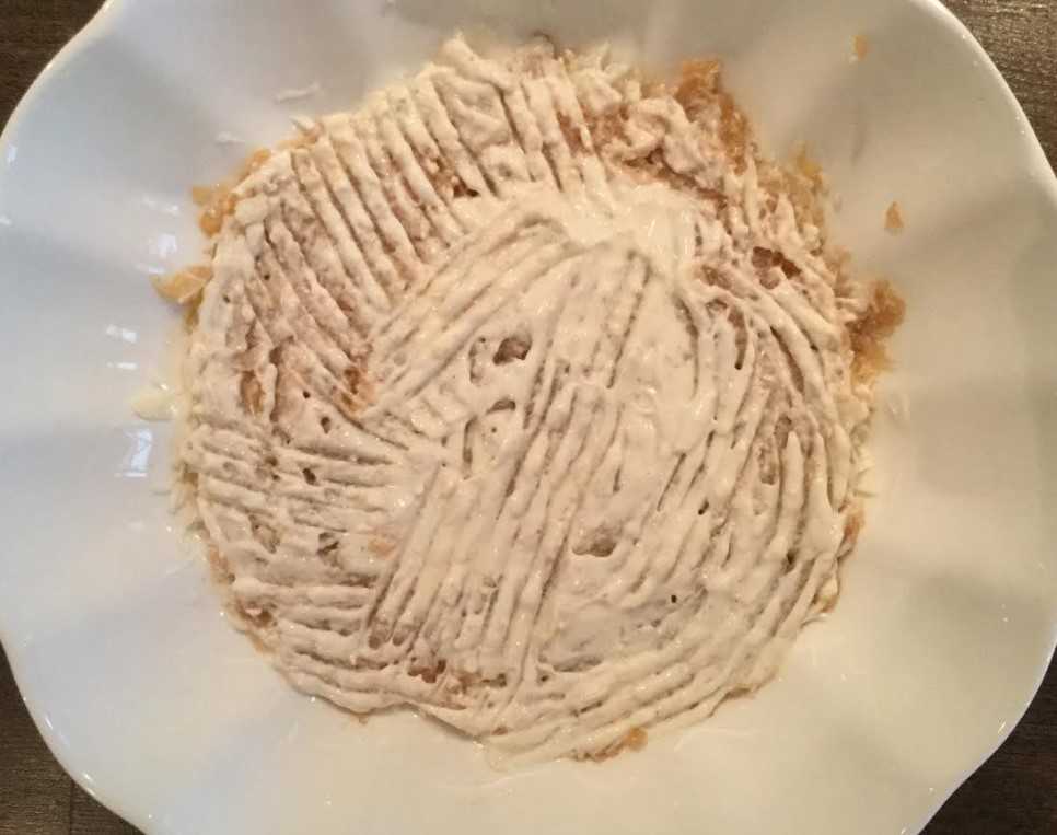 Залейте полученную массу майонезом. Достаточно будет буквально пары столовых ложек.
