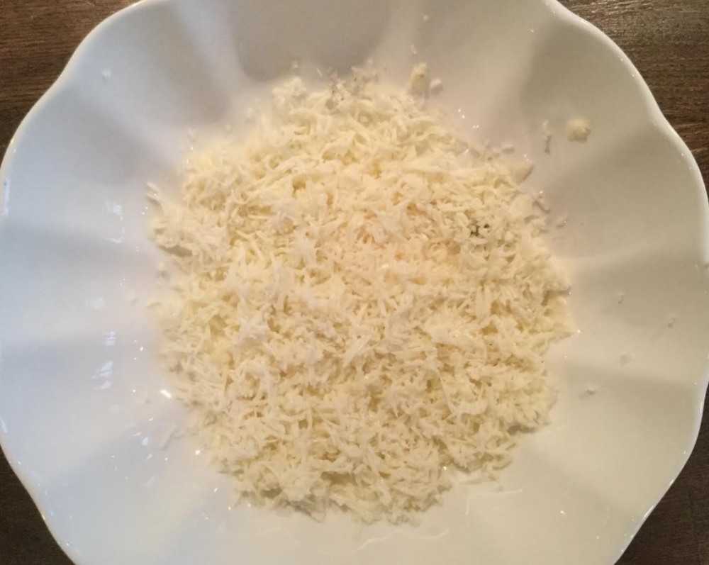 3.Сыр натрите на мелкой терке. Выбирайте сорта потверже, чтобы стружка получилась максимально рассыпчатой.