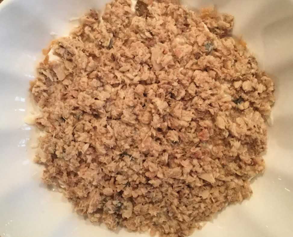 - Сливаем весь сок с рыбы и при помощи вилки нужно её растолочь.