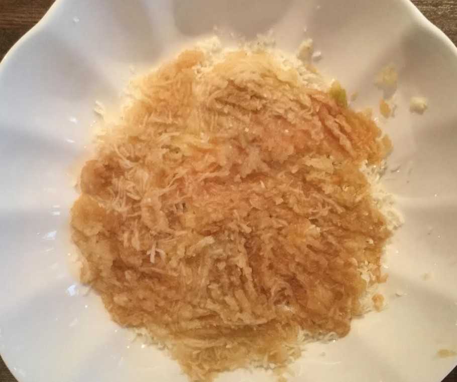 8.Второй слой — тертый белок. Его смазывать не нужно, потому что рыба пропитает его своим соком и маслом.