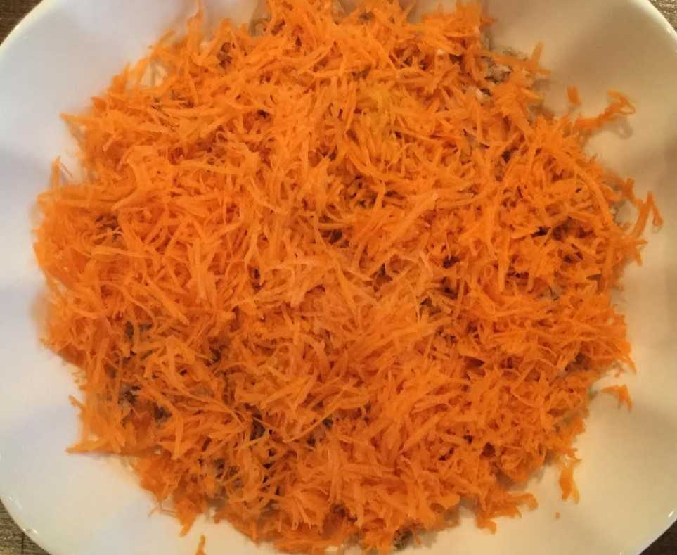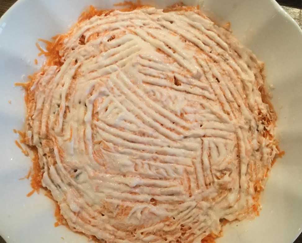 - Промазываем майонезом, выкладываем лук и морковь, которую тоже смазываем майонезом