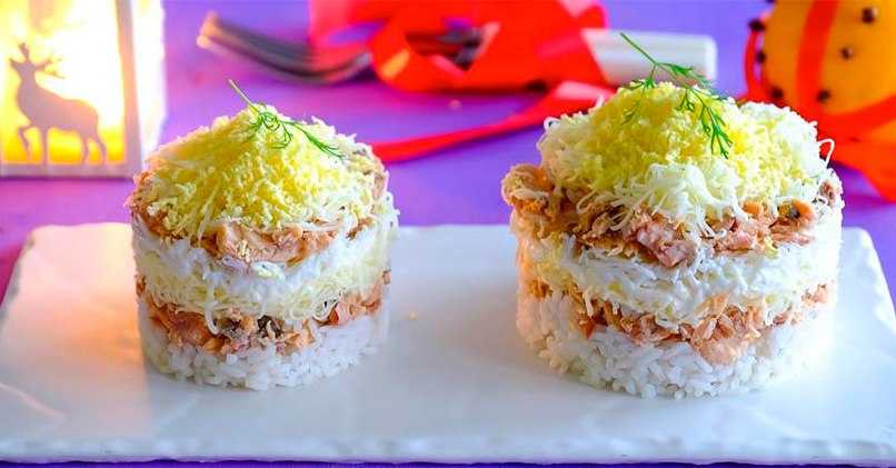 Этот вариант очень красиво смотрится на срезе. Белый пушистый рис сделает кушанье мягким и насыщенным. Только придется изменить порядок выкладки слоев и первым поместить рис. Картофель можно не класть, а вот рыбы, сыра, масла и желтков положим побольше. Если вы не хотите использовать много майонеза, кладите натертое сливочное масло, оно прекрасно слепит ингредиенты и добавит жирности.