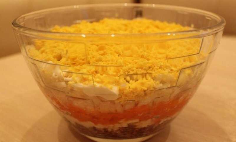 8. Далее потрите вареную морковь на терке и разложите очень ровно. Чуть чуть примните, а затем намажьте и этот слой майонезом. Верхний слой майонеза можно сделать уже немного потолще, чтобы украшение салата из желтка лучше на нем держалось. Если выкладываете салат горкой, то можно намазать и боковые стороны салата.