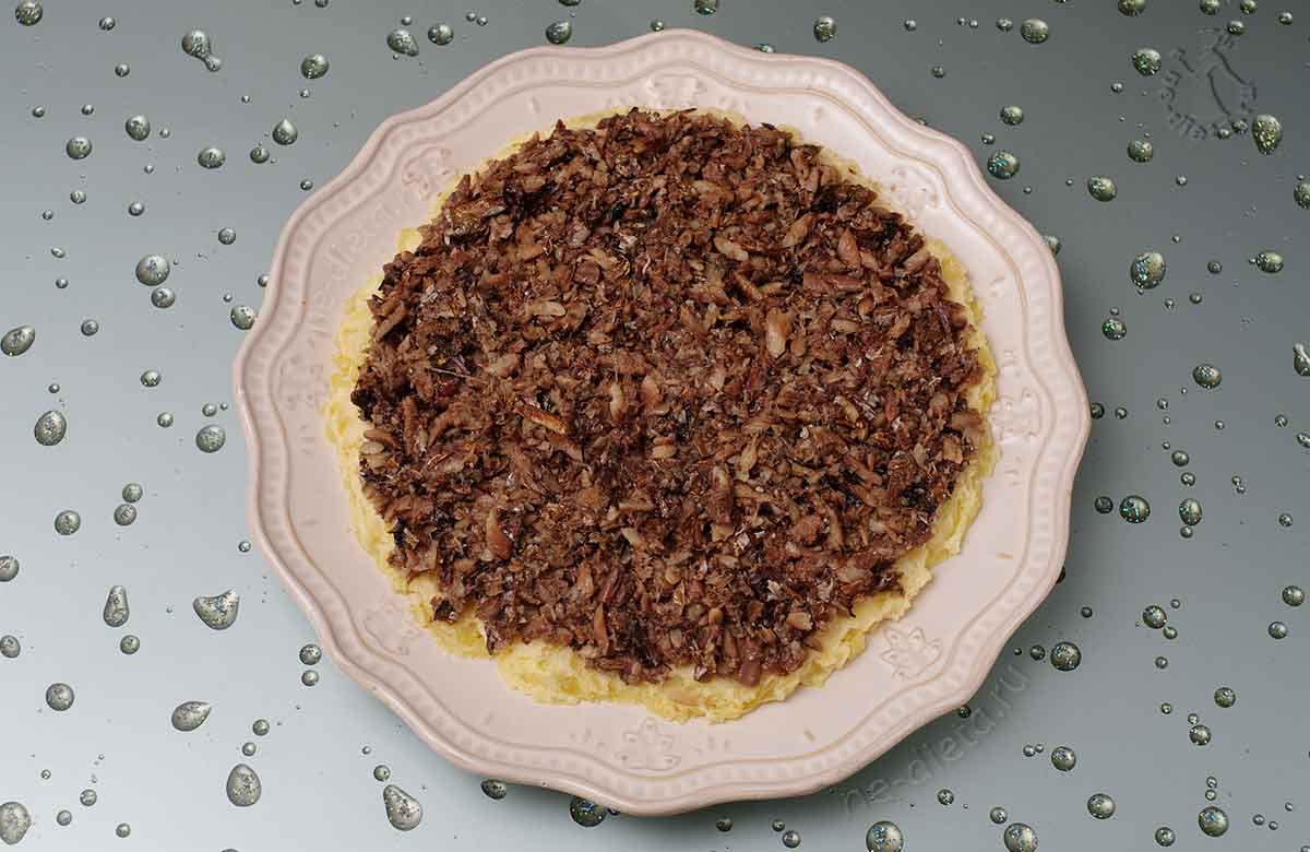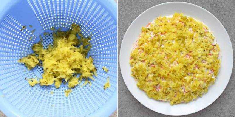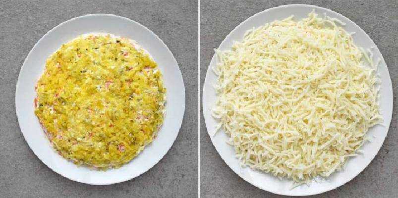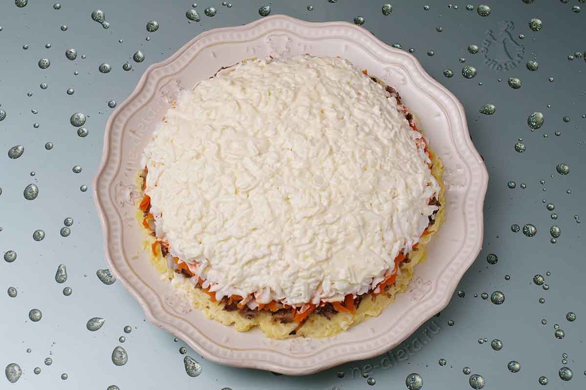 8. Трём небольшой кусок моцареллы на мелкой терке и равномерно распределяем по салату. Слегка уплотняем вилкой и смазываем 3 столовыми ложками майонеза.