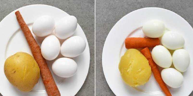 1. Овощи будем готовить в кожуре. В небольшую кастрюлю помещаем 1 средний картофель и 1 среднюю морковь. Заливаем водой, доводим до кипения на среднем или сильном огне. Уменьшаем огонь до минимума и готовим морковь 15-20 минут, вытаскиваем из кастрюли. Продолжаем готовить картофель еще 10 минут, пока он не станет мягким. Сливаем воду и даём овощам постоять при комнатной температуре, прежде чем снимать кожуру. Можно поставить в холодильник для более быстрого охлаждения. Холодные овощи можно очистить перед приготовлением.
