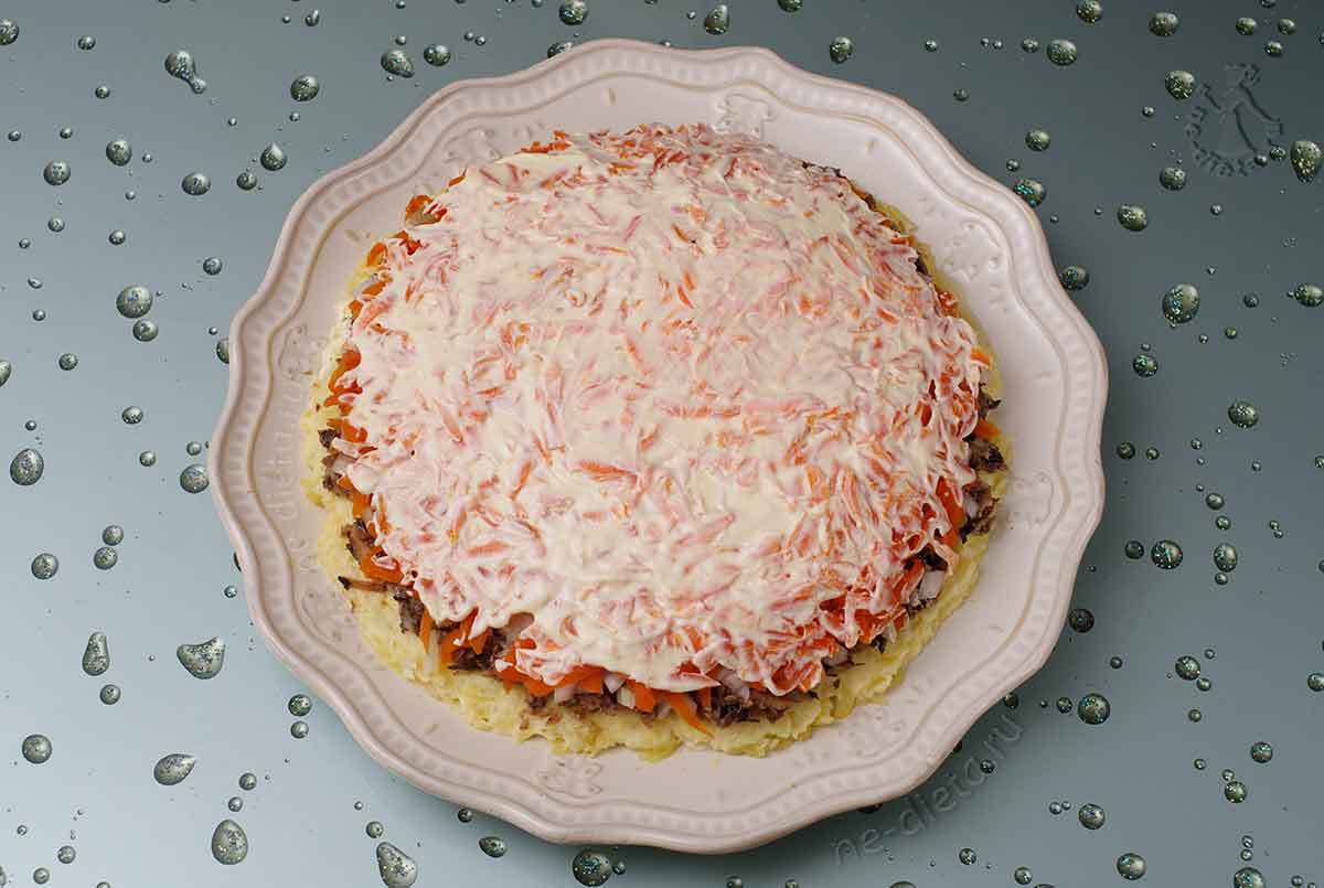 6. Также, мелко натереть 1 среднюю морковь поверх салата, слегка уплотнить.