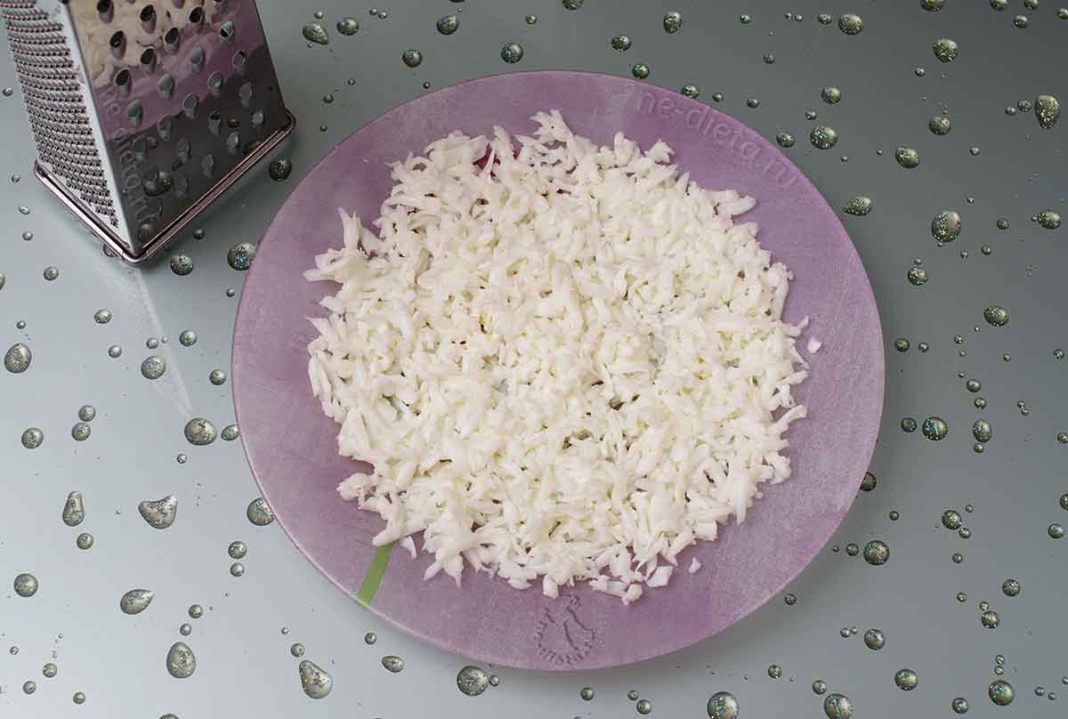 - Сыр пропустить сквозь терку со средними лезвиями, отпрессовать, нанести майонез.