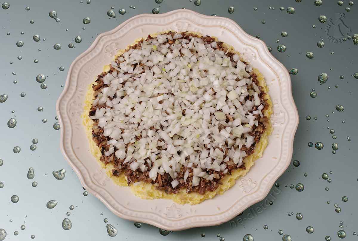 - В тарелку положить закуску слоями: рыбу, белки, морковь, лук, картофель. Каждый слой надо промазать майонезом или сделать из него «сеточку».