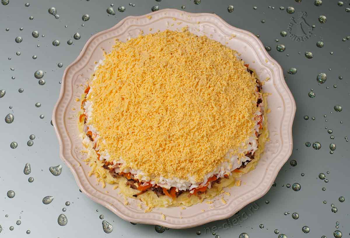 После майонеза выкладываем слой белка куриных яиц. Их надо натереть на тёрке и не смешивать с желтками, так как последние у нас будут украшением.